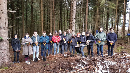 Am Samstag, den 04.12.2021 um 10.30 Uhr machten sich ca. 20 Parlamentarier*innen, deren Freunde sowie Begleiter aus der Geschäftsstelle und von goepflanzt mit dem Bus auf den Weg in Richtung Hardegsener Wald. In der Nähe von Üssinghausen trafen wir den Förster Ralf Sepan, bewaffneten uns mit Spaten, Handschuhen und 1.080 Buchen- und Esskastaniensetzlingen und suchten die von Windbruch und Borkenkäfer zerstörte Fläche im Wald auf.